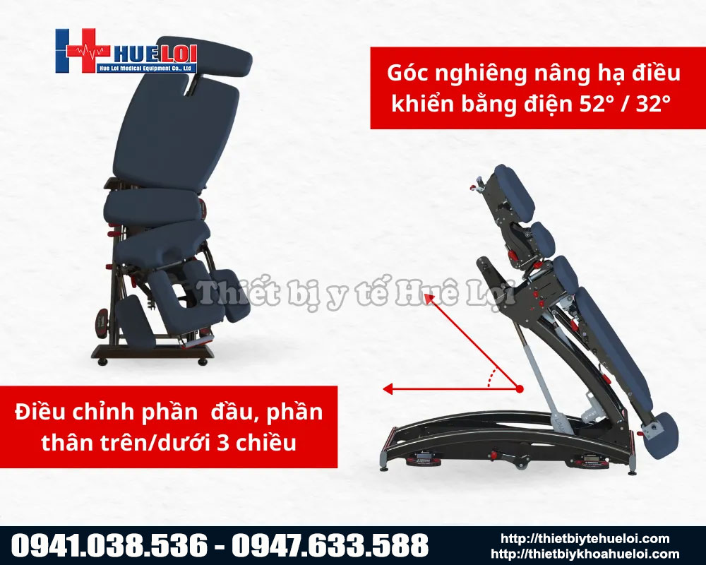 Điều chỉnh phần ngực trên 3D: Nâng/hạ dọc +15°/-13°, nghiêng ngang 0–18°, cho phép điều chỉnh chuẩn xác theo từng phác đồ trị liệu.